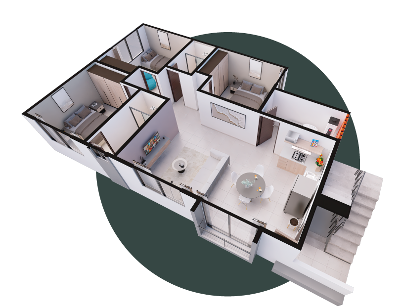 Diseño que busca equilibrio entre funcionalidad y confort, con espacios que se conectan de forma natural y reciben abundante luz y ventilación. Los acabados en materiales resistentes y tonalidades neutras generan una atmósfera cálida, pensada para perdurar.